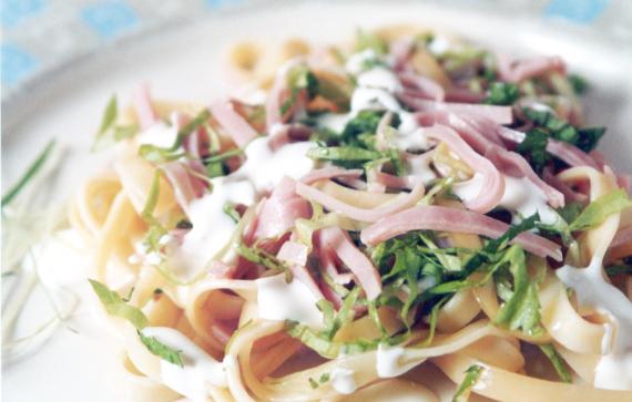 Prepare o molho misturando o alho, sal, pimenta, hortelã, azeite de oliva, limão e o presunto.