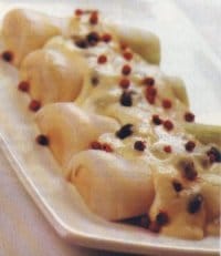 - Coloque o alho-poró em uma travessa, regue com o creme preparado e distribua a pimenta.