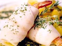 - Cubra-os com cogumelos refogados, coloque os camarões por cima dos cogumelos e enrole de forma que os camarões fiquem no centro.