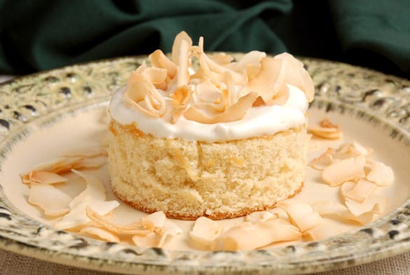 - Espalhe o marshmallow sobre o bolo, salpique coco ralado e decore com as cerejas.