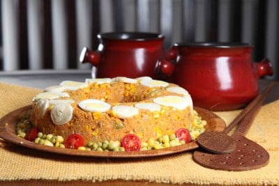 - Leve em uma forma com furo central, untada com azeite e enfeitada com ovos cozidos e palmito.
