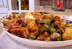 • Coloque os cubos de abacaxi e os pedaços de lombo, misture bem e regue com o molho agridoce.