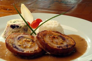 - Corte o rocambole de lombo em fatias não muito grossas e disponha em um prato raso.