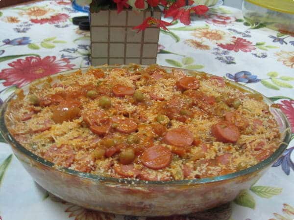 - Faça uma camada de arroz, deite por cima o molho com as salsichas, coloque o queijo ralado, faça outra camada de arroz e termine com o molho de salsichas e o queijo.