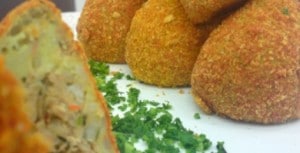 - Passe cada coxinha em 1 clara batida com 1 colher (chá) de azeite e em seguida na farinha de rosca misturada com colorau a gosto.