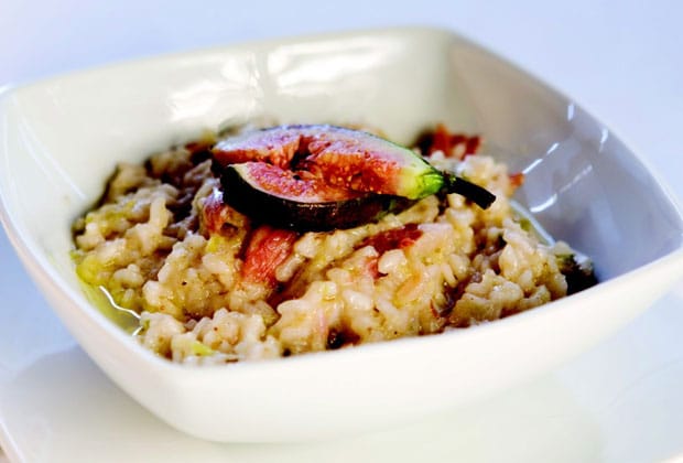 - Quando o risoto estiver ao dente (aproximadamente 15 minutos), apagar a chama e adicionar o queijo parmesão ralado, a manteiga e o presunto de Parma em fatias finas.
