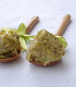 • Misture o pistache moído, a manteiga e o leite condensado numa panela e leve ao fogo baixo, mexendo sem parar até que solte do fundo da panela.