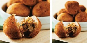 - Unte as mãos com um pouco de óleo, faça bolinhas com a massa de arroz, achate-as, recheie com o frango e molde novamente as bolinhas.