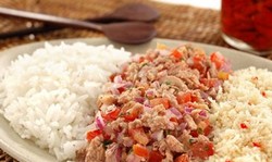 - Em uma travessa, arrume o arroz de um dos lados, o vinagrete no centro e a farofa do outro lado.