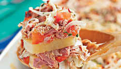 • Faça camadas: batata, depois coloque o tomate, cebola, atum e a mussarela.