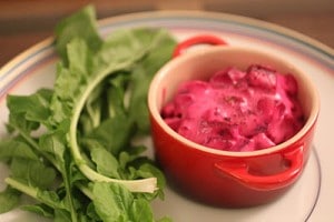• Coloque em um recipiente resistente ao calor do forno a beterraba, o creme de ricota e o vinagrete.