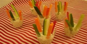 - Divida a pasta reservada entre as mini taças e distribua entre elas os palitos de vegetais, de forma que as cores fiquem alternadas.