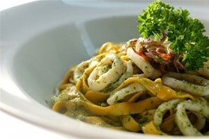 - Em uma frigideira coloque o azeite e deixe aquecer, junte a lula já cortada em anéis e tempere com sal e pimenta deixe dourar e flambe com o vinho branco, junte o fettucine já cozido em água e sal (bem escorrido).