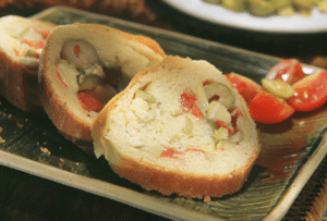 • À parte, misture as azeitonas verdes, os tomates e o queijo e distribua sobre as massas de pão abertas.