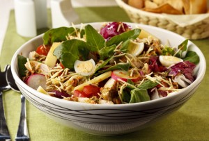 - Em uma tigela funda coloque as folhas de alface americana, as folhas de radicchio, as tiras de frango grelhadas, os rabanetes, as tiras de tomates e de queijo, os ovos cortados ao meio e por fim as folhas de espinafre.