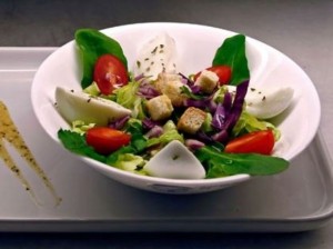 • Monte a salada fazendo uma cama de rúcula, coloque a mussarela de búfala, os tomates, os radicchios no centro e os croutons por cima e acrescente a mostarda Dijon e o mel.