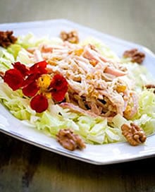 - Distribua as metades das nozes e as flores comestíveis por cima da salada.