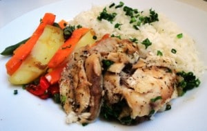 - Após os trinta minutos de forno, abra o papel alumínio, adicione os legumes em volta dos filés e volte ao forno para dourar, com o papel alumínio aberto.