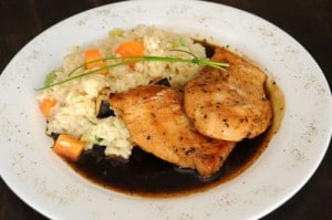 - Em uma frigideira, coloque o peito de frango, o suco de laranja, o açúcar mascavo e as raspas de laranja e deixe reduzir.