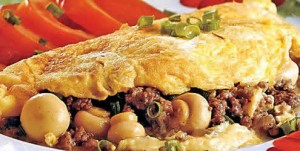 - Espalhe a carne, os cogumelos e a cebolinha na metade da omelete, incline a frigideira sobre o prato de servir e deixe-a, ainda aberta, escorregar para o prato.