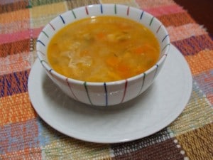 - Junte todos os legumes picados, o talo de salsão inteiro, o caldo do cozimento do frango e a água.