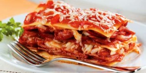 - Em um refratário, alterne camadas de molho de tomate, massa de lasanha, linguiça e mussarela.