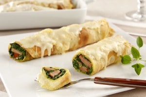 - Acomode as panquecas em um refratário, cubra com o molho branco e polvilhe o parmesão.