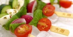 • Monte os espetinhos intercalando o tomate-cereja com os rabanetes, a mussarela temperada, o pepino japonês e as folhas de hortelã.