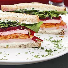 • Em cima, arrume as fatias de peito de peru, a cenoura ralada, o queijo branco, a beterraba ralada, o mix de folhas temperado com um fio de azeite e sal.
