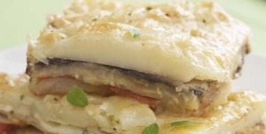 • Em um refratário, untado com manteiga, monte a lasanha, alternando camadas de batata, abobrinha, berinjela e tomate, regadas com azeite e salpicadas com pimenta, orégano, salsa e polvilhadas de mussarela ralada.