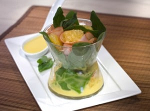 - Em uma saladeira coloque as folhas de espinafre, os gomos da laranja, o peito de peru e a cebolinha.