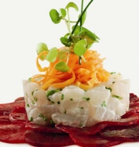 - Com um aro redondo, coloque o tartare no meio do carpaccio.