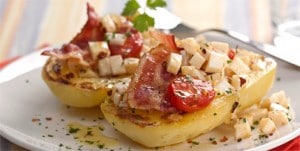 - Distribua as batatas em uma travessa, por cima, coloque o refogado de palmito e finalize com as fatias de bacon.