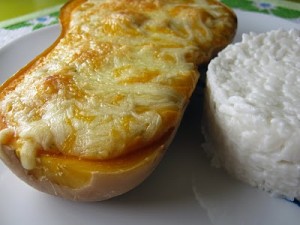 • Desembrulhe a abóbora e retire a polpa, deixando uma parede, para receber o recheio. Coloque num prato e amasse com um garfo.