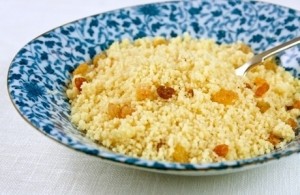 • Enquanto isso coloque numa tigela o cuscuz marroquino, misture o sal e as passas.