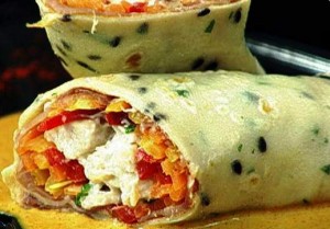 • Pegue uma massa de panqueca coloque no centro do disco de panqueca 3 fatias de presunto Parma, fatiado; uma porção de tirinhas de cenoura; uma porção de pimentão vermelho em tiras e uma porção de peito de frango.