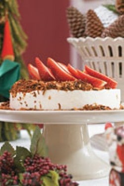 - Desenforme a mousse em um prato bonito, decorando com o coco queimado e morangos cortados ao meio.