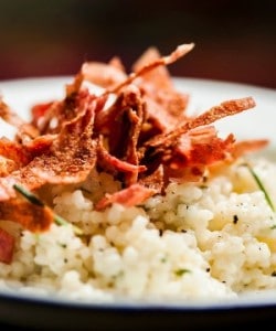 - Desligue o fogo e adicione o restante da manteiga, as ervas picadas, os queijos e bata bem para emulsionar; sirva imediatamente com o chips de presunto.