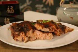 - Depois de pronto espere amornar e pincele o salmão, disponha em uma assadeira com grelha afim de que o peixe não fique em contato direto com o fundo da assadeira e leve ao forno quente (160ºC) por aproximadamente 20 minutos.