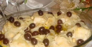 - Coloque em uma travessa uma camada do purê, distribua o bacalhau e cubra com a cebola, o alho e as azeitonas.