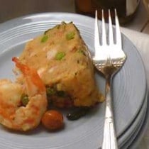 - Arrume os camarões grandes no fundo, cubra com a massa, e para enfeitar as laterais espalhe algumas fatias de tomates e de folhas de louro.