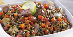 - Em uma saladeira, misture a carne; a lentilha, a cebola com a cenoura e tempere com o molho.