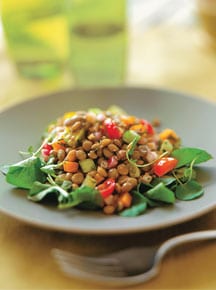 • Monte a salada num prato: coloque o agrião e, por cima, a lentilha com os outros ingredientes.