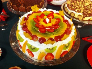 - Coloque a segunda parte do bolo, umedeça, cubra com metade das frutas picadas e cubra com uma fina camada de chantilly.