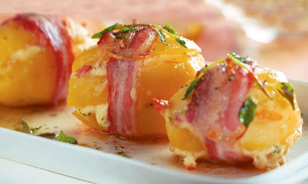 - Envolva a batata com uma tira de bacon e prenda com um palito.
