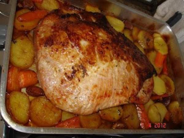 - Arrume todos eles em volta do pernil e distribua os alhos inteiros.