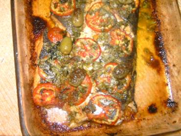 • Coloque tudo em cima do salmão suco de limão, sal, pimenta, o coentro, o azeite, o tomate picado e as azeitonas.