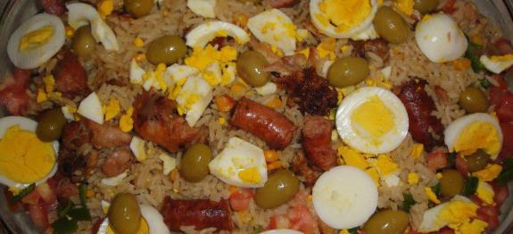 - Em um refratário, coloque todo o arroz e decore com tomates e pimentões picados, os ovos cozidos (em rodelas) e azeitonas a gosto.