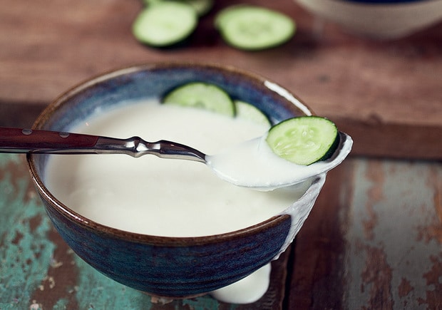 • Em uma tigela, misture o pepino, a hortelã seca, 2 2/3 xícaras da coalhada fresca e o sal.