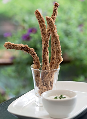 - Retire os sticks da fritura diretamente para uma bandeja com farofa, para que fiquem cobertos por igual.